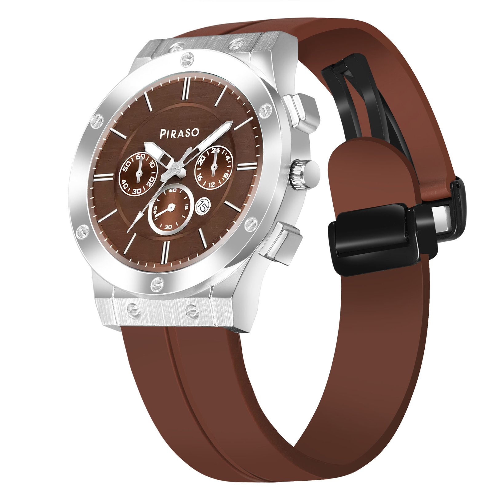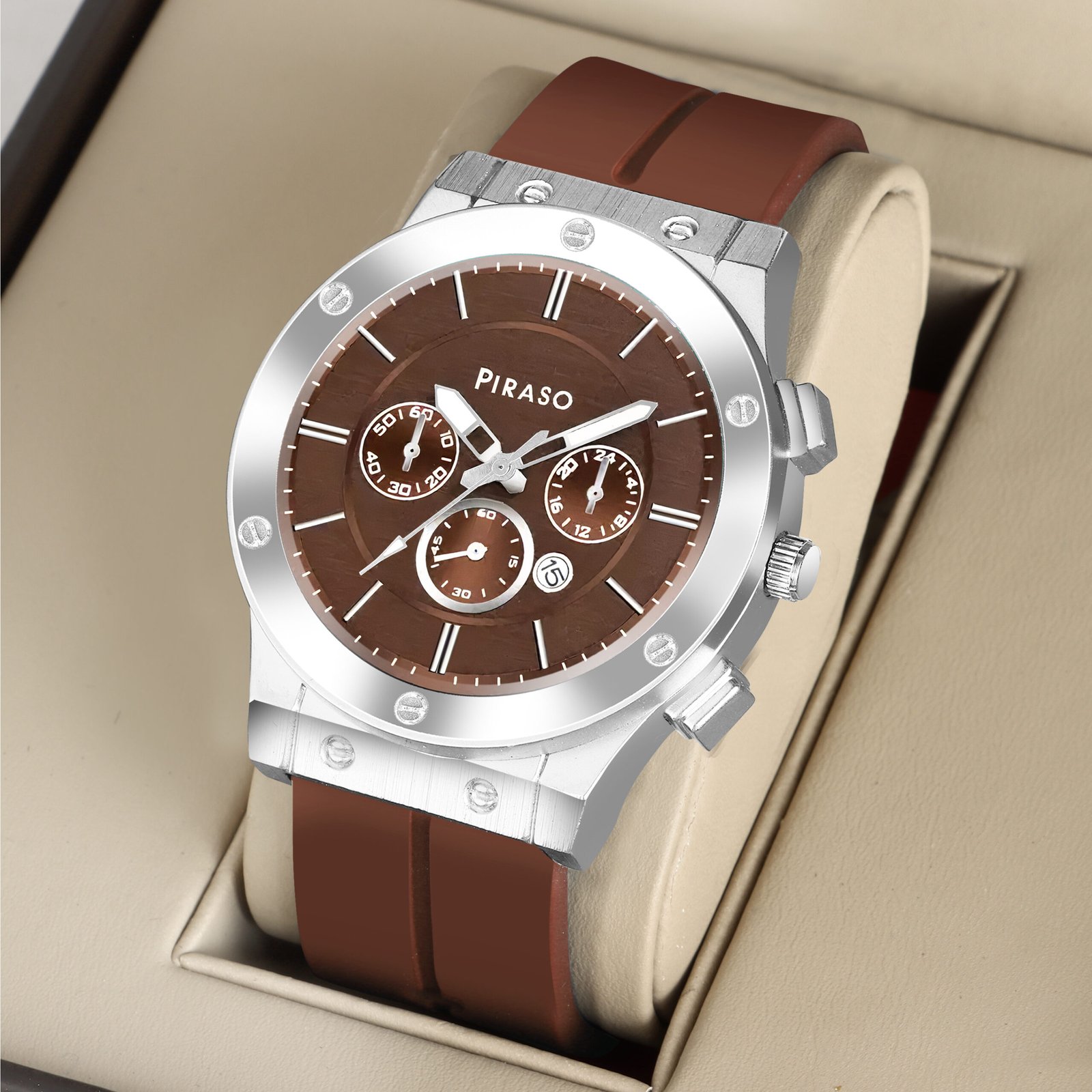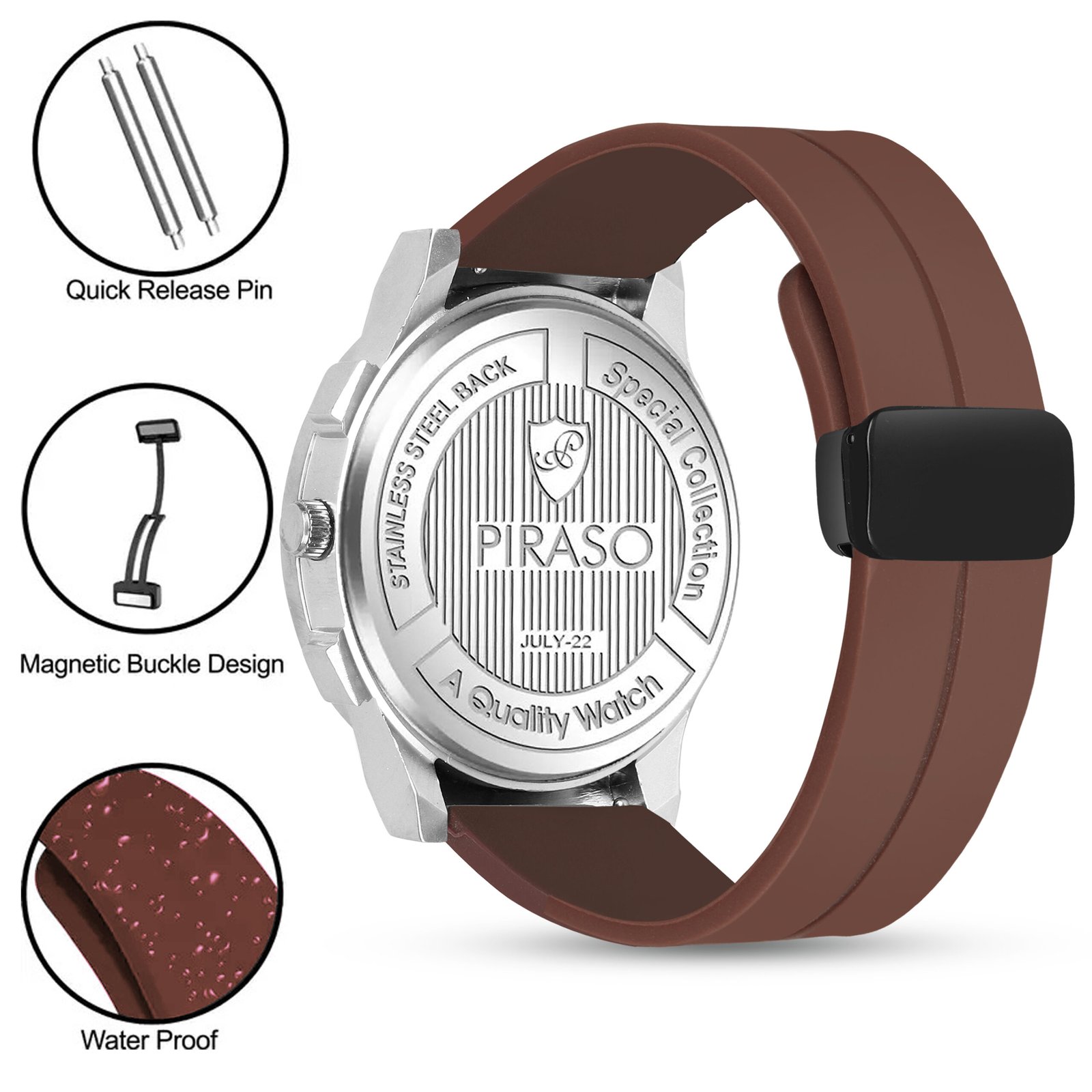 Piraso Brown Date Dial & Brown Silicone Magnetic Lock Strap Analog Watch For Men-HUB 2022 SILVER BROWN MAGNETIC STRAP