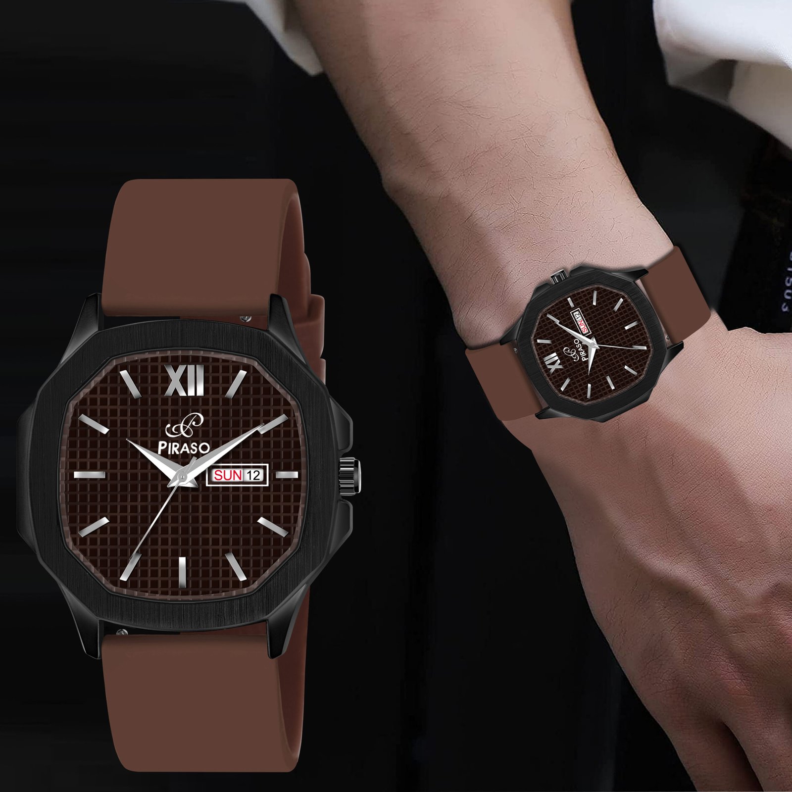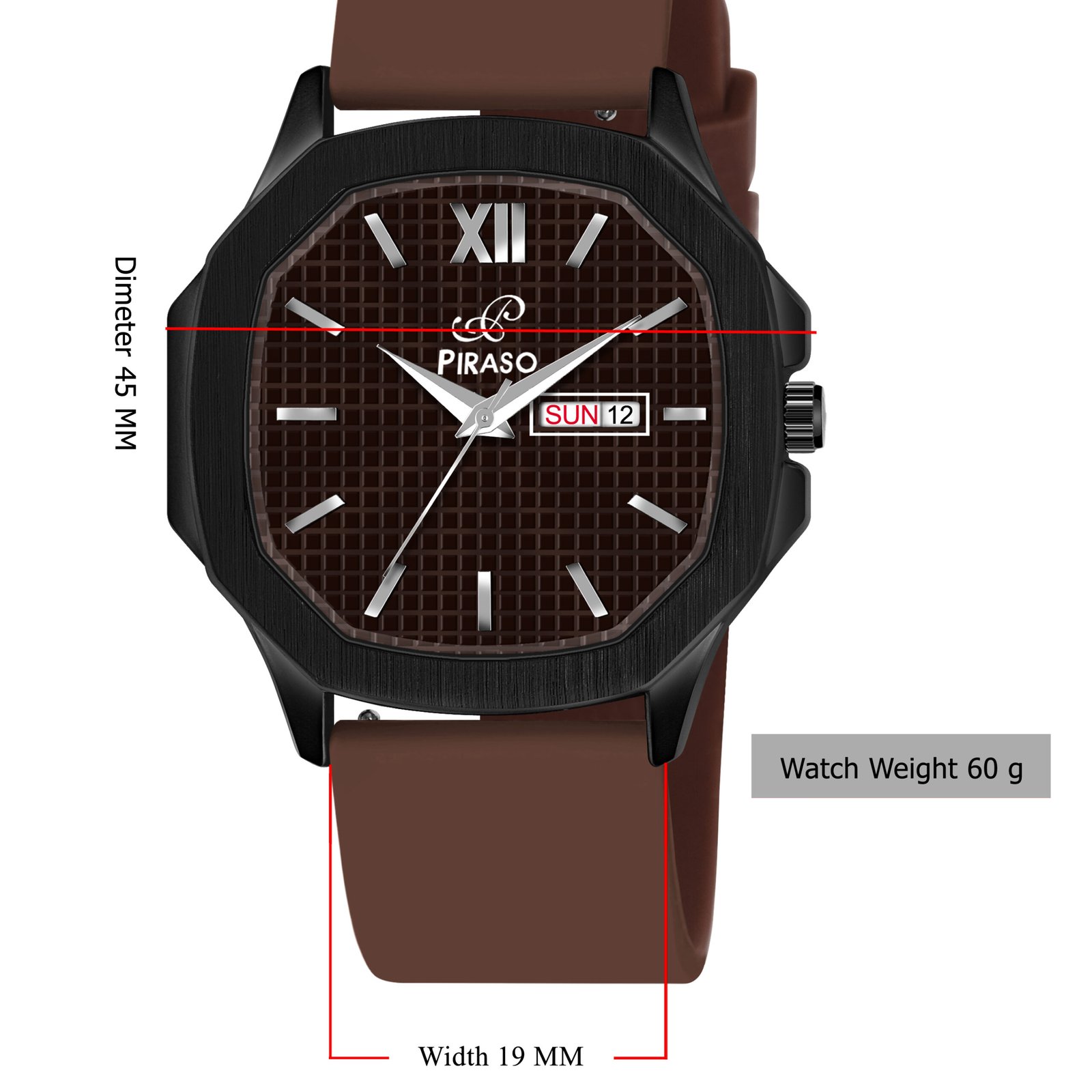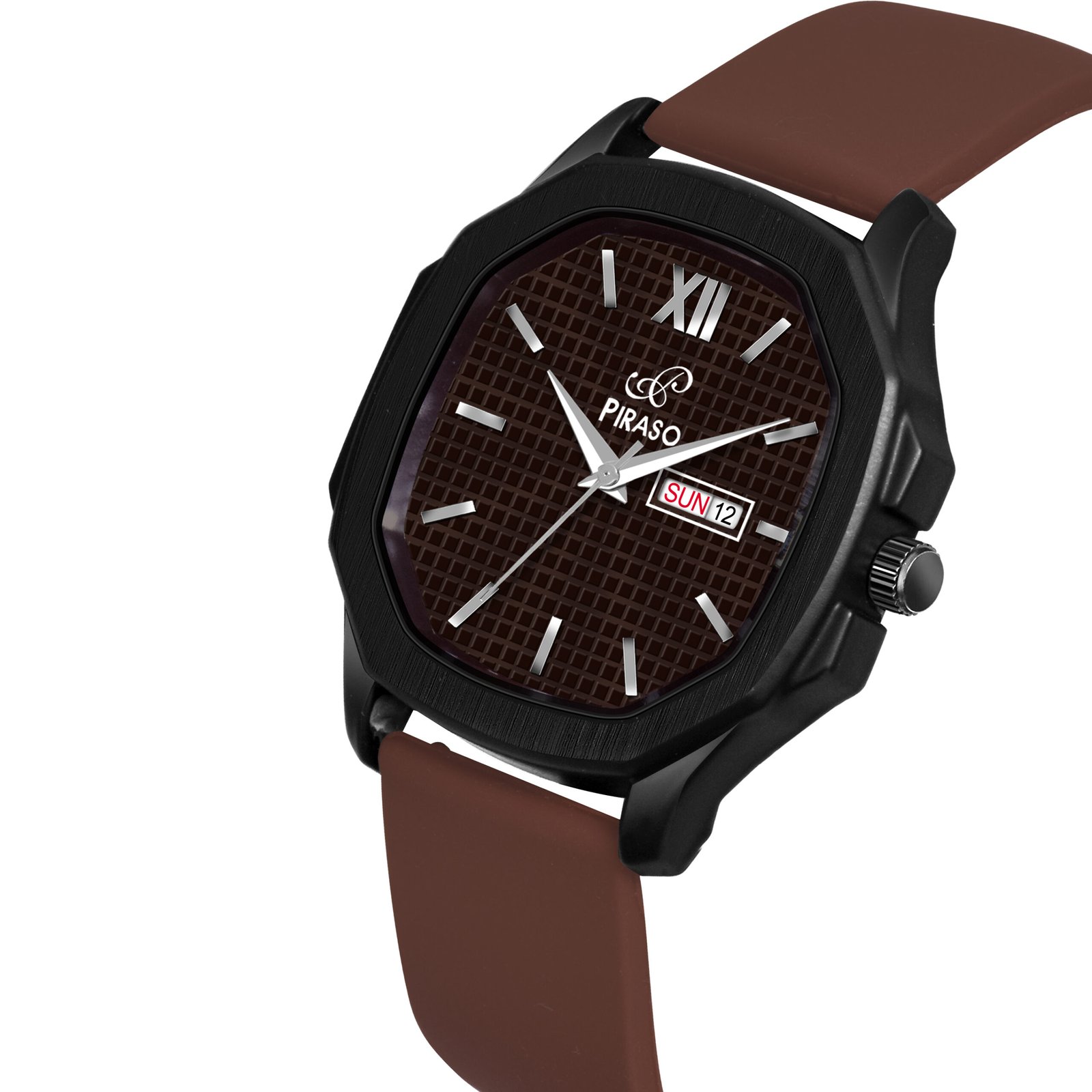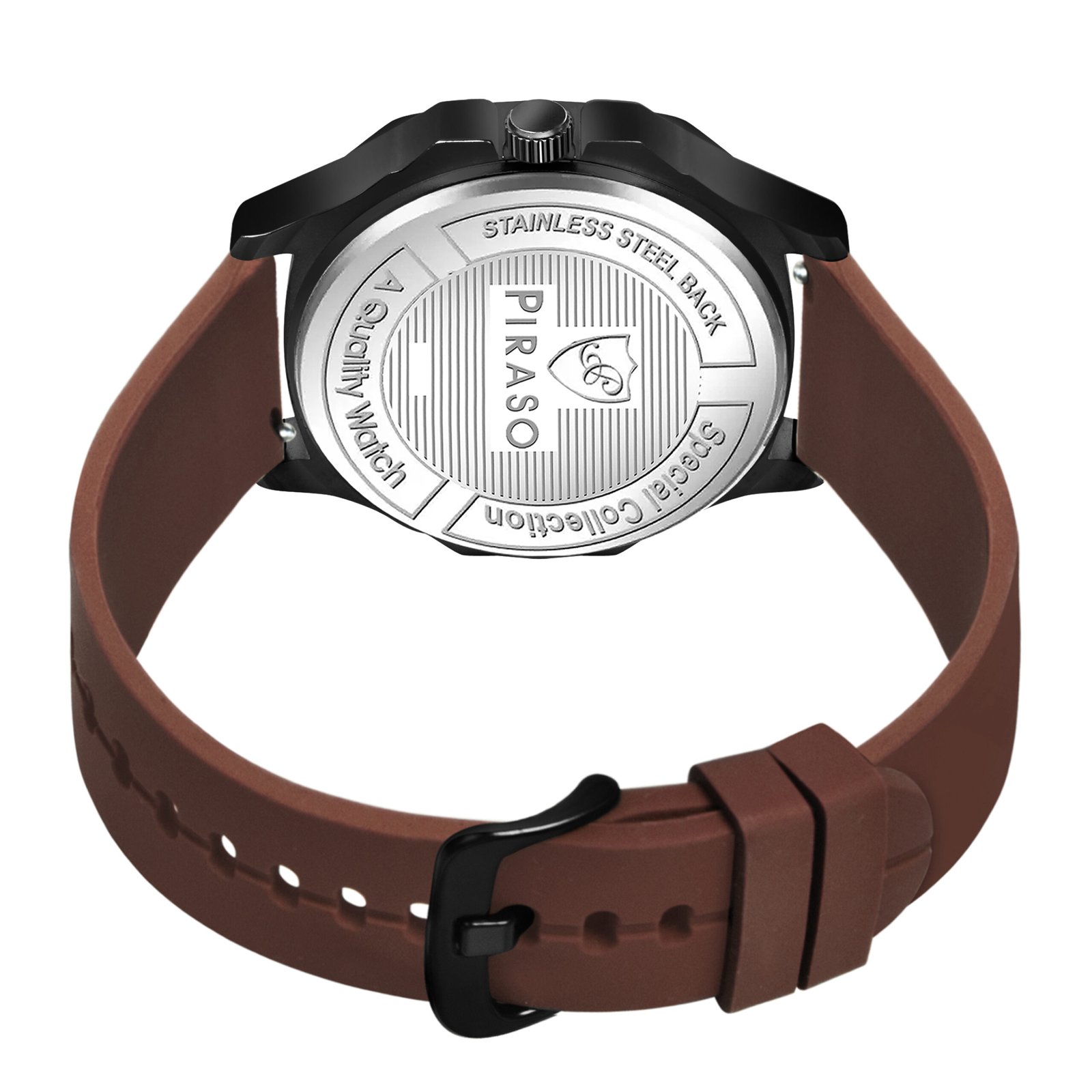 PIRASO Brown Square Dial & Brown Silicone Strap Watch For Men-PS3027 BLACK BROWN SILICONE STRAP