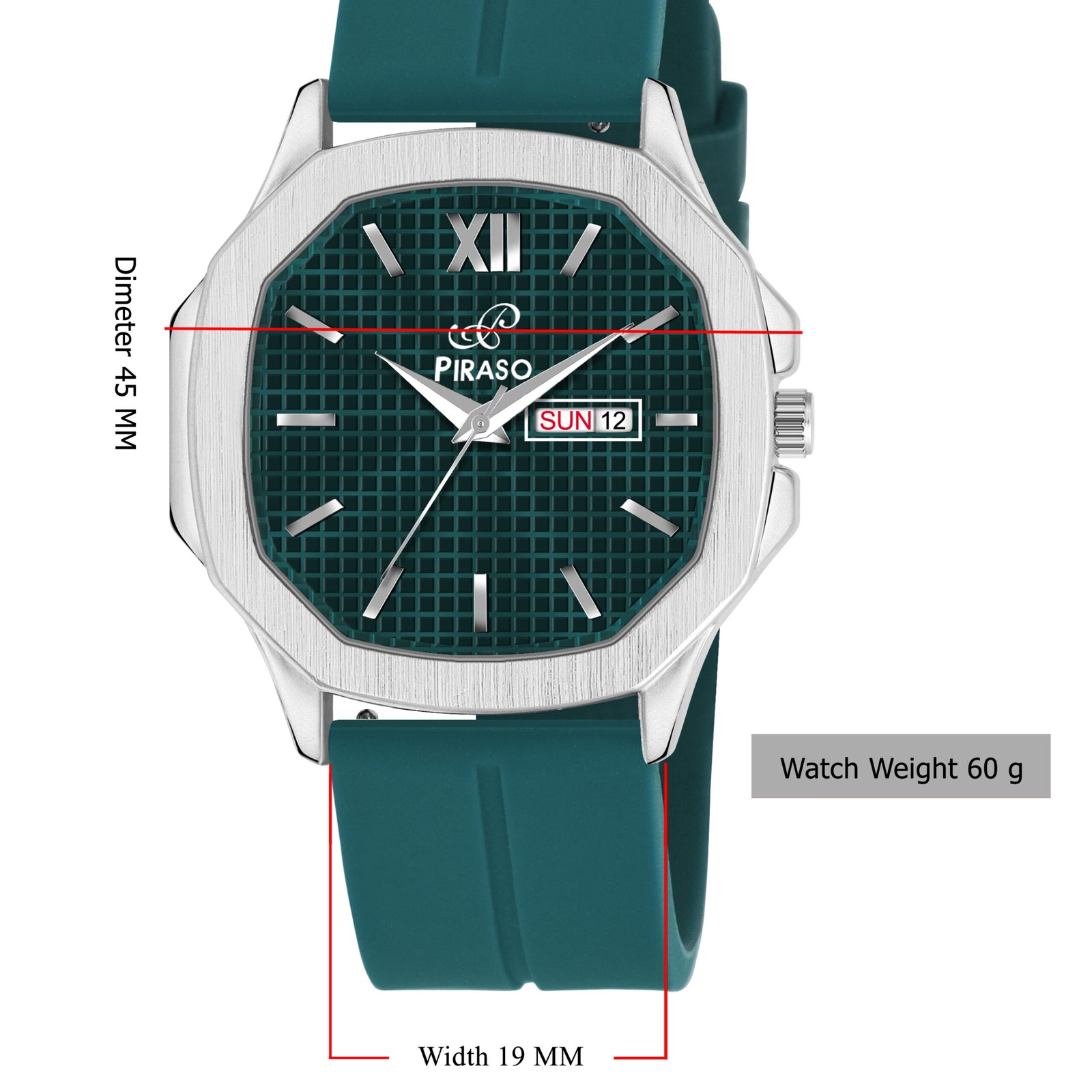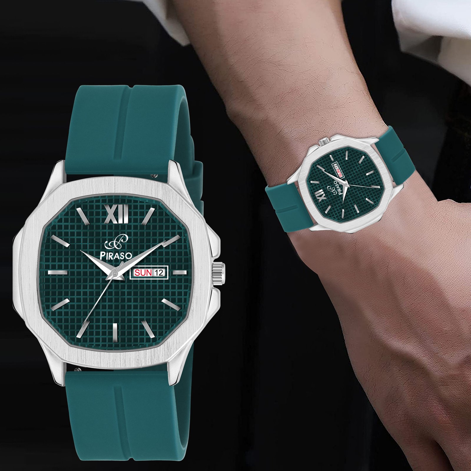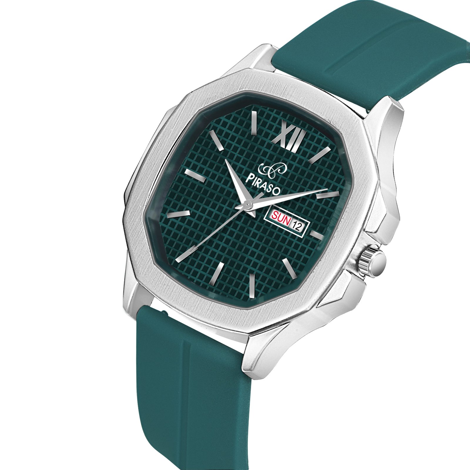 PIRASO Day Date Turquoise Dial & Turquoise Silicone Strap Watch For Men-PS3029 SILVER TURQUOISE SILICONE STRAP